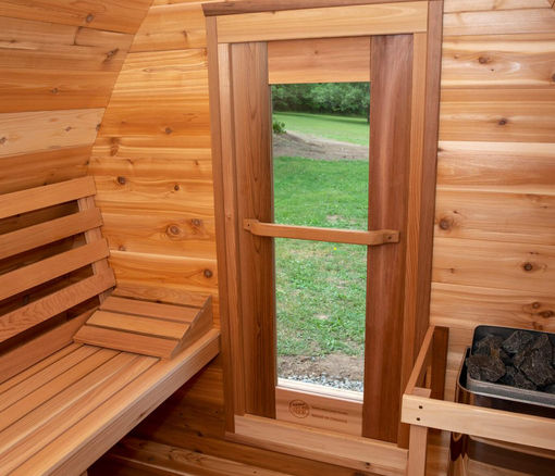 This organic rain-drop shaped outdoor sauna will enhance your urban backyard or lakeside cottage. The extra head space and wonderful design comes in Western red cedar or Knotty Red Cedar and is available in various sizes (7x7, 8x6, 8x7 or 8x8).